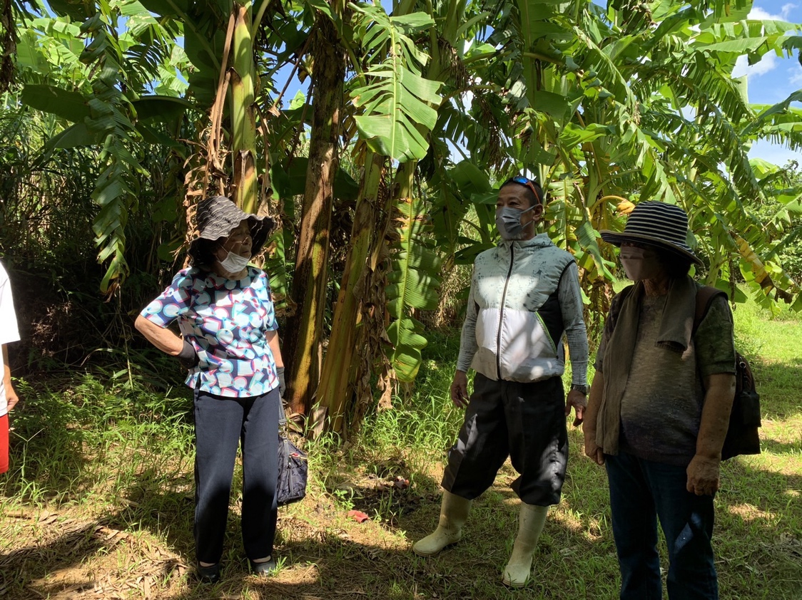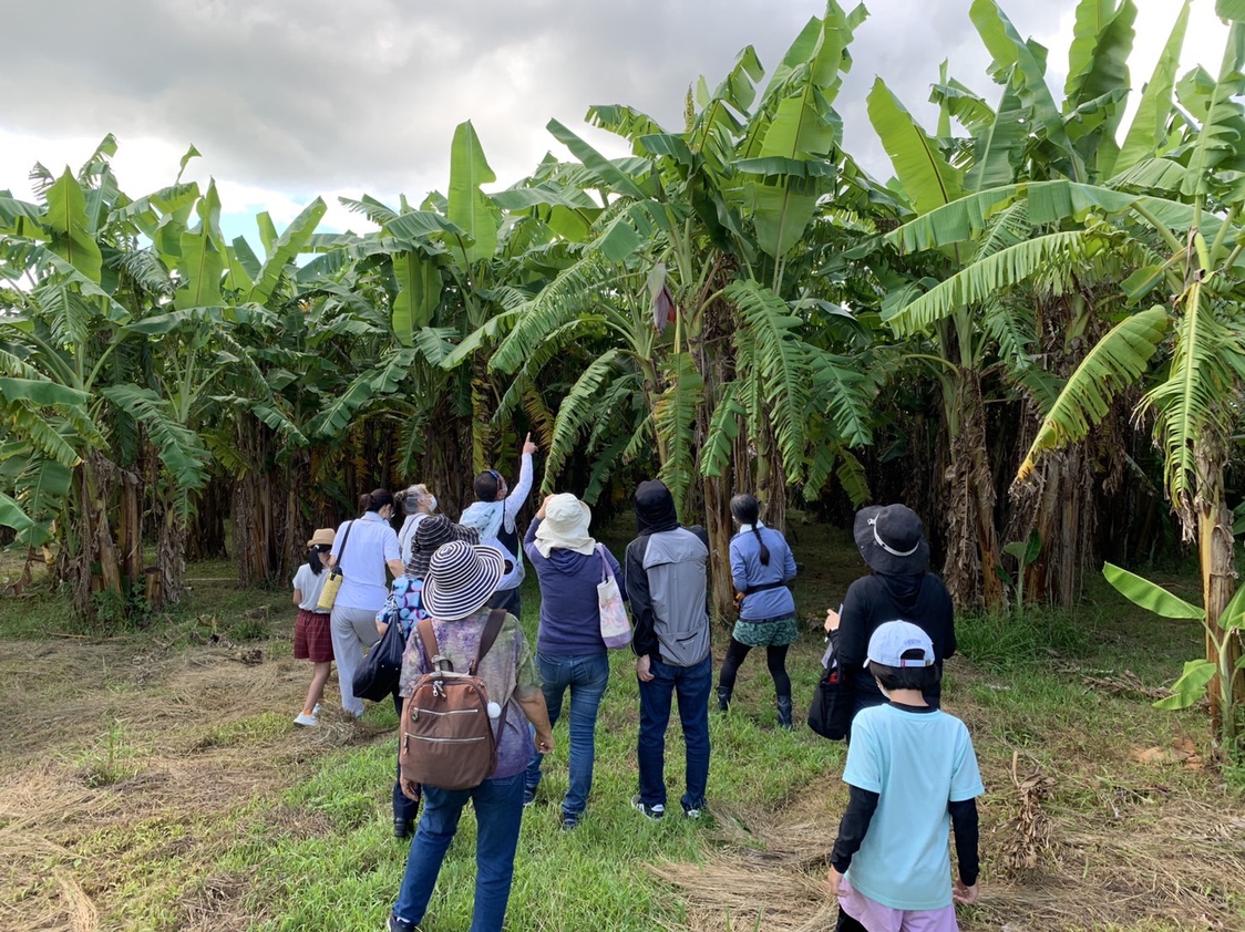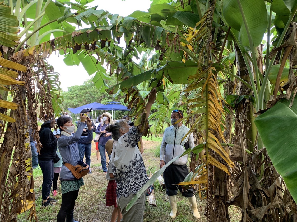 生産者の山城典哉さんが、アップルバナナの特徴や生産地、栽培方法等をお話ししてくれました。説明を受けた後、早速バナナ畑?いえ、バナナ林道へ。