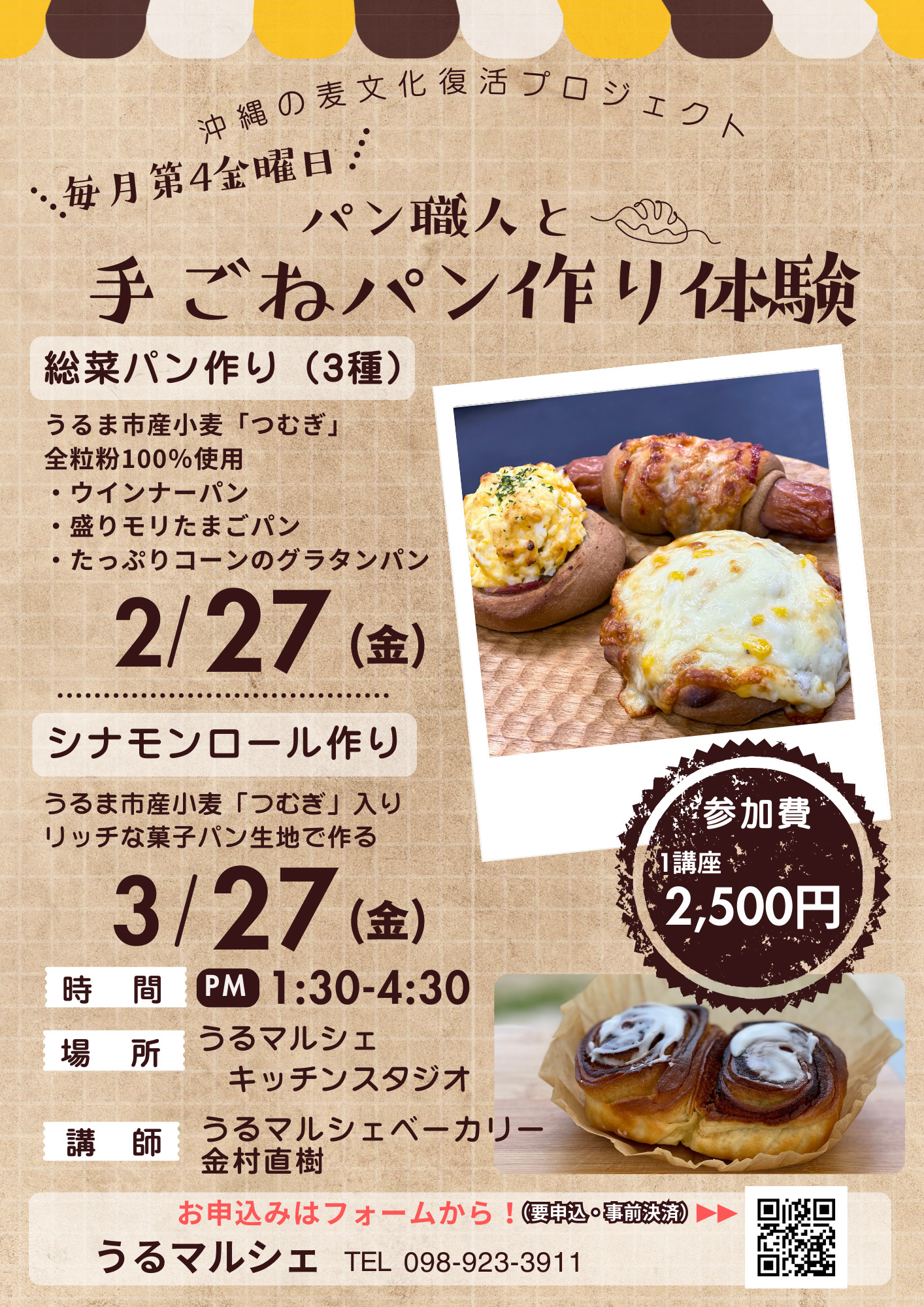毎月第4金曜日 パン職人と手ごねパン作り体験 うるま市津堅島を中心に収穫された小麦「つむぎ」で美味しいパンを作ってみませんか? うるマルシェベーカリーのスタッフと一緒に小麦の香りともっちり食感を味わいながら、沖縄の麦文化の魅力を感じてください。 ◇お申し込みはこちら https://x.gd/Xh2PK ①2月のパンは、うるま市産小麦「つむぎ」全粒粉100%で作る総菜パン3種 *開催日:2月27日(金) 13:30~16:30* [...]