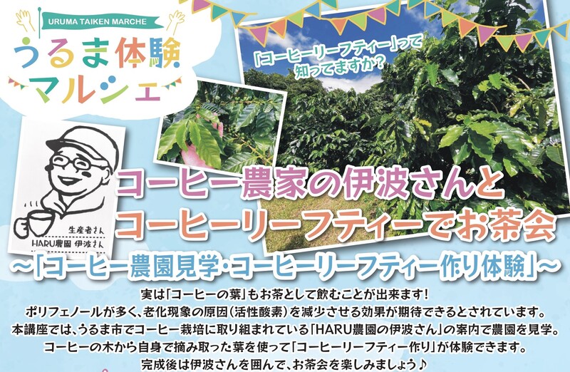 ホーム/イベント情報/うるま体験マルシェ/うるま体験マルシェ特別企画/【9/24】コーヒー農家の伊波さんと「コーヒーリーフティー」でお茶会~コーヒー農園見学&コーヒーリーフティー作り体験~