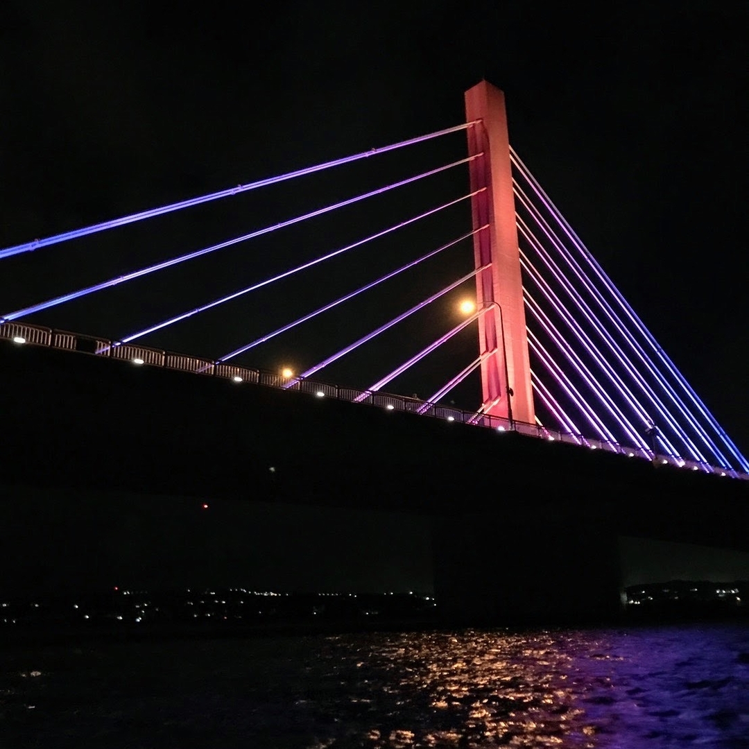 夜の海中道路でライトアップされた「あやはし」を眺める、『ナイトツーリング』です。