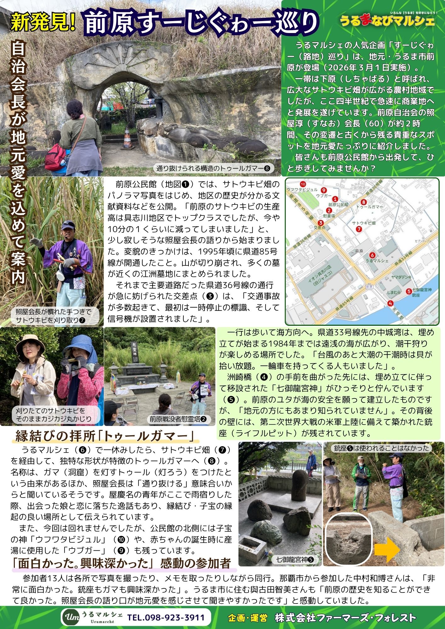 《体験レポート》うるま市前原の変遷を歩いて知った View Larger Image うるマルシェの地元・うるま市前原は、急速に商業地へと発展しています。前原自治会長の照屋淳さんが、昔のことを思い出しながら案内してくださいました。 By urumarche|2026-03-27T12:30:00+09:002026.03.27| この記事をシェアする FacebookTwitter電子メール 関連投稿 《番外編》海から豚がやってきた日、生産者さん大活躍 2025.11.20 《番外編》うるまのもずく極みの宴――「宮國由紀江の薬膳ダイニング」 2025.08.10 《番外編》海ぶた&黄金芋のマリアージュ――「宮國由紀江の薬膳ダイニング」 2025.11.27 《番外編》うるま市の工芸作家ら15工房が集結、技の共演 2025.08.07 《番外編》うるマルシェで体験いろいろ。「楽しかった♪」 2025.08.06