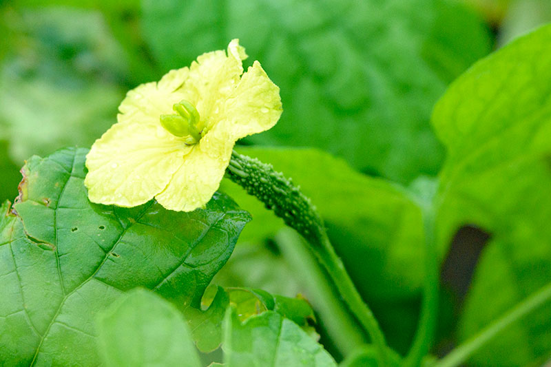 私たちが畑にお邪魔した6月は、ちょうどゴーヤー栽培の最盛期。ゴーヤーの黄色い可憐な花の花言葉はなんと「強壮」だそうです。いかにもゴーヤーらしくて、なんだか微笑ましいですね。花の下にすでにちっちゃなゴーヤーらしきものが見える上の写真は雌花です。