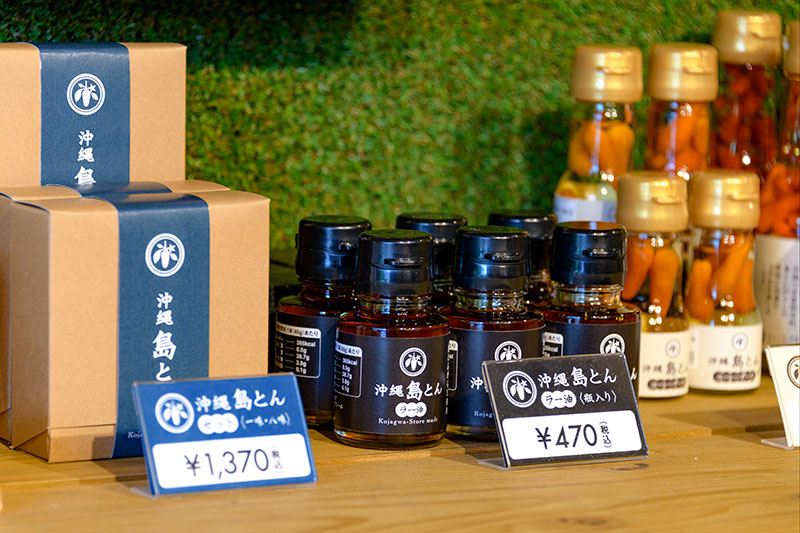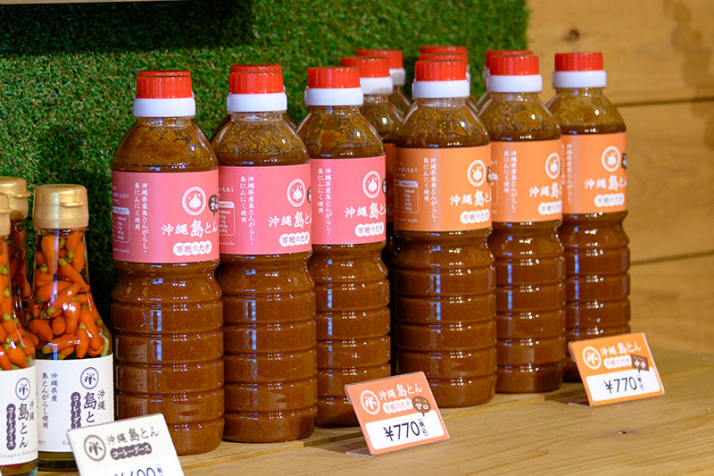 商店で製造しているのは、古謝さんのお母さんのレシピを受け継いだオリジナルの「沖縄 島とん」シリーズ。「とん」は“とんがらし”のことで、原料には自家栽培の島とうがらしが使われています。店内には万能タレやコーレーグース、ラー油、七味・八味が並んでいました。